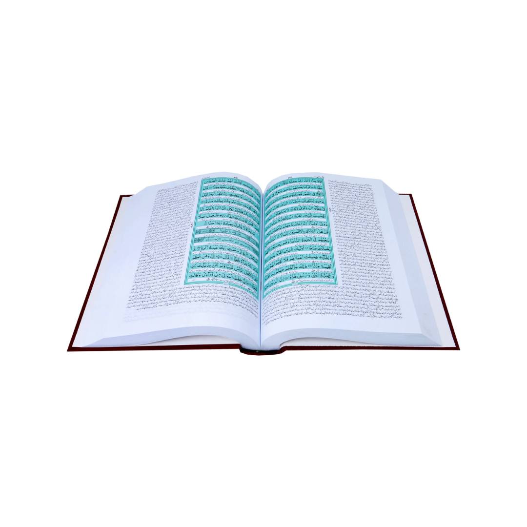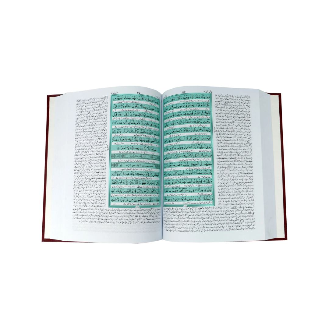 Printed in two-color ink on high-quality offset paper, the text features a clear Arabic script with an easy-to-read Urdu translation and detailed commentary beneath each verse. The hardcover binding ensures durability, while the elegant design adds a touch of sophistication. Perfect for daily study, recitation, and reflection, this Quran is a treasured addition to every Muslim home and library.